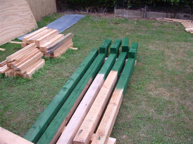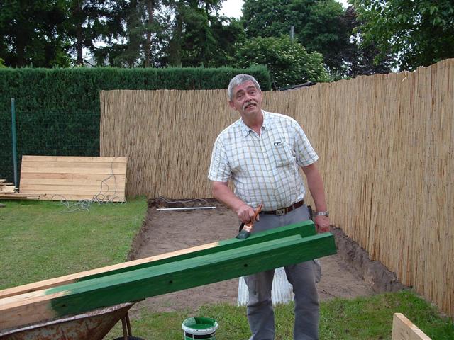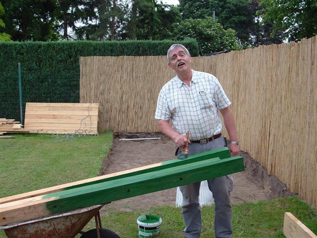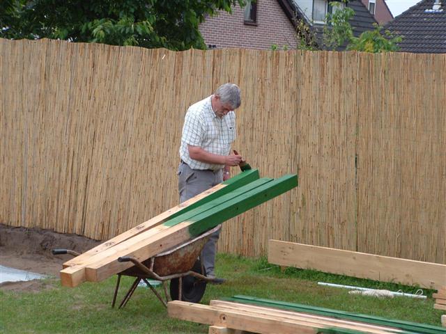 Dit is nu echt een klusje voor Gerard. Elke avond of ochtend even de palen verven die de grond in gaan.