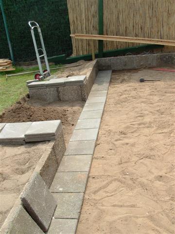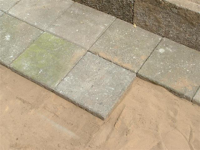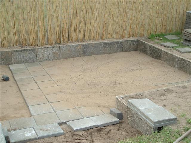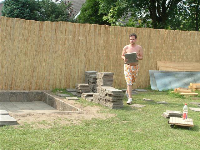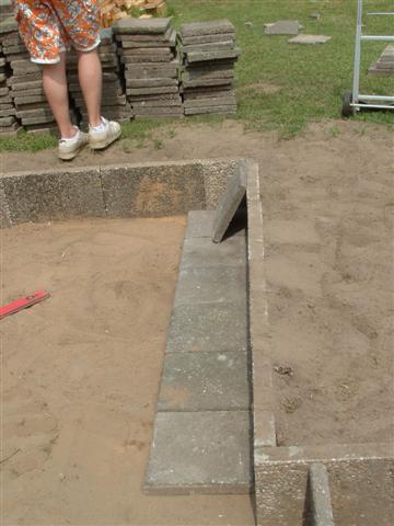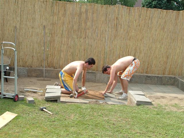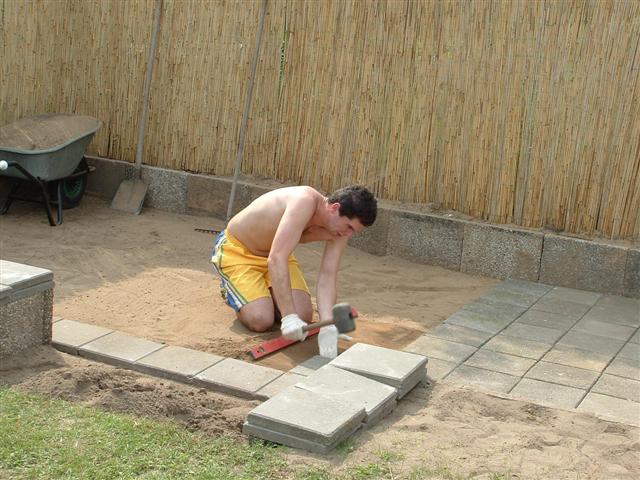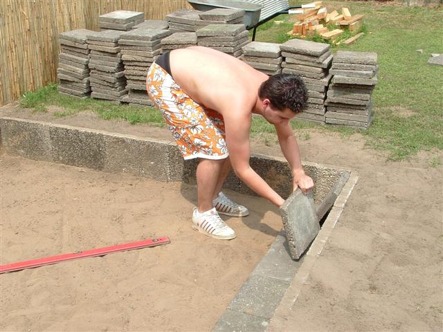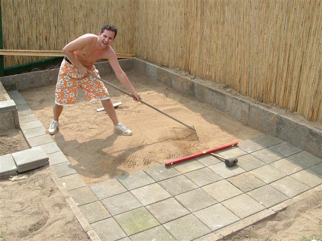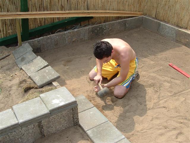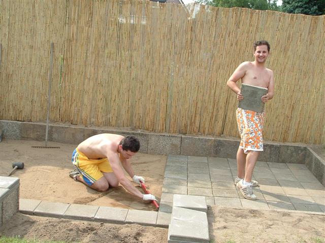 het zand nog eerst een beetje egaliseren en dan tegels leggen. Jeroen gaf de tegels aan waarna Gerben ze goed legde. Het eerste rijtje ging