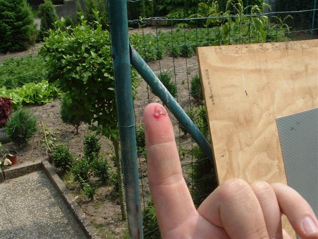 raak. Jeroen had de steen verkeerd vast en bleef met zijn vinger haken aan de tegel waardoor er een stuk vel van zijn vinger werd gereten.